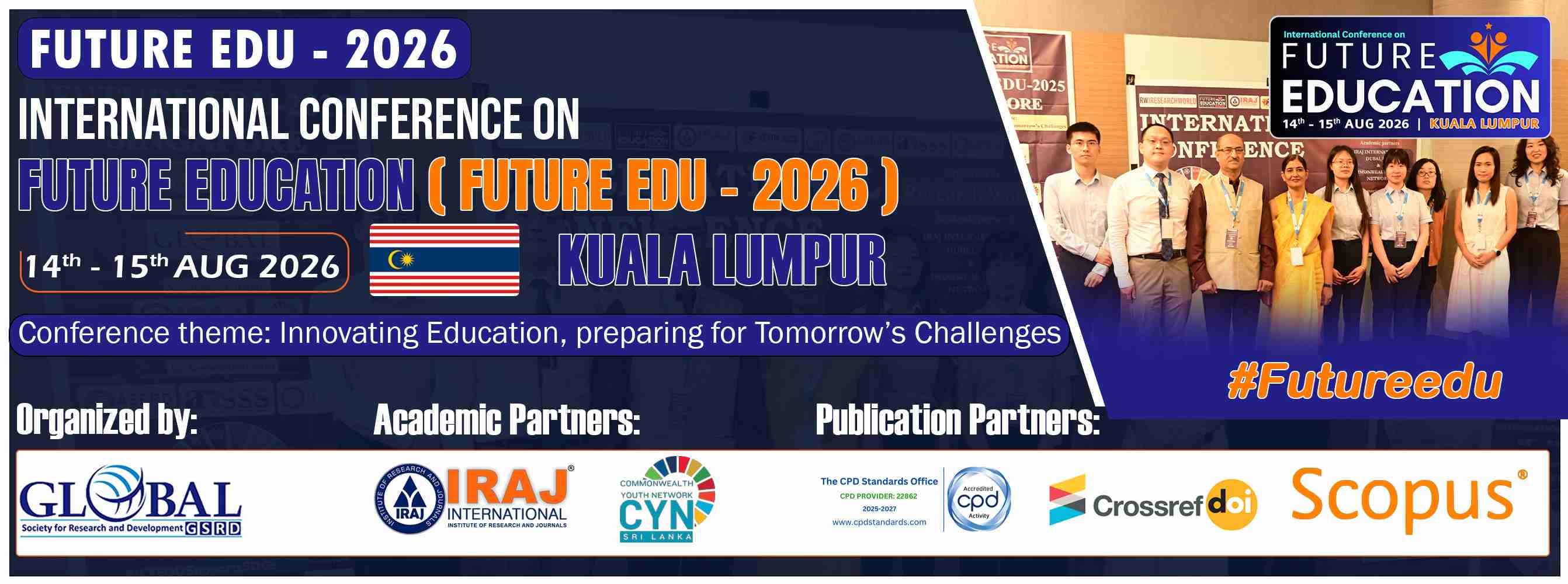 Welcome to the International Conference on Future Education (Future Edu-2026), Organized by GSRD : and in collaboration with IRAJ International during 14th-15th Aug 2026 at KualaLumpur,Malaysia join us for a vibrant exchange of ideas and insights at the forefront of multidisciplinary educational and Scientific research. Engage with esteemed scholars, researchers, and practitioners as we explore innovative approaches and current trends shaping the landscape of Education, learning and Science across diverse disciplines. Together, let's delve into transformative research that inspires and redefines the future of learning.